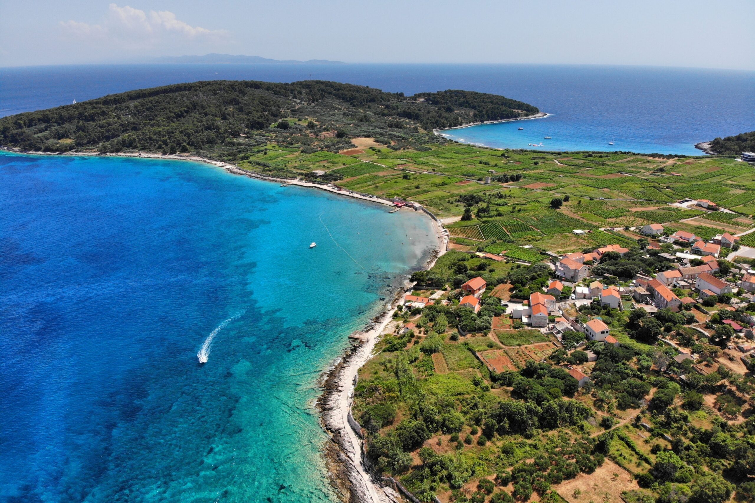 The sixth-largest Adriatic island, 46 km long and with its turquoise coast, beaches, caves, coves, capes, and sunlit vineyards, is a real decoration on the Adriatic.